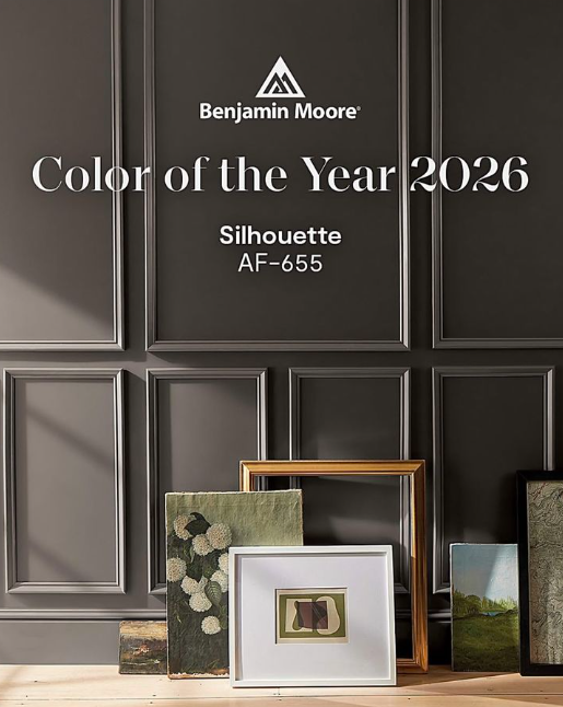 “Reminiscent of tailored suiting, this elegant color weaves rich espresso hues with refined notes of charcoal. A distinctive color that weaves luxurious burnt umber with delicate notes of charcoal, Silhouette AF-655 lends style and grace to the Color Trends 2026 palette of enchanting pales and handsome midtones.” – courtesy of Ben Moore