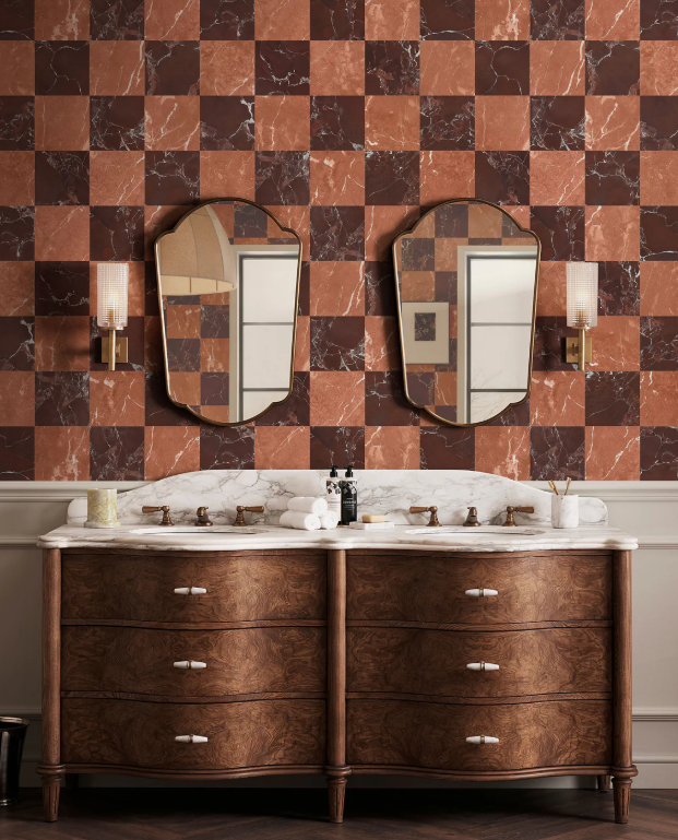 The next trend for ’26 is DEF an offshoot of Art Deco’s popularity, as checkerboard floors, were a key component of that style. The new spin? You don’t have to stick with the traditional black-and-white traditional combo.
