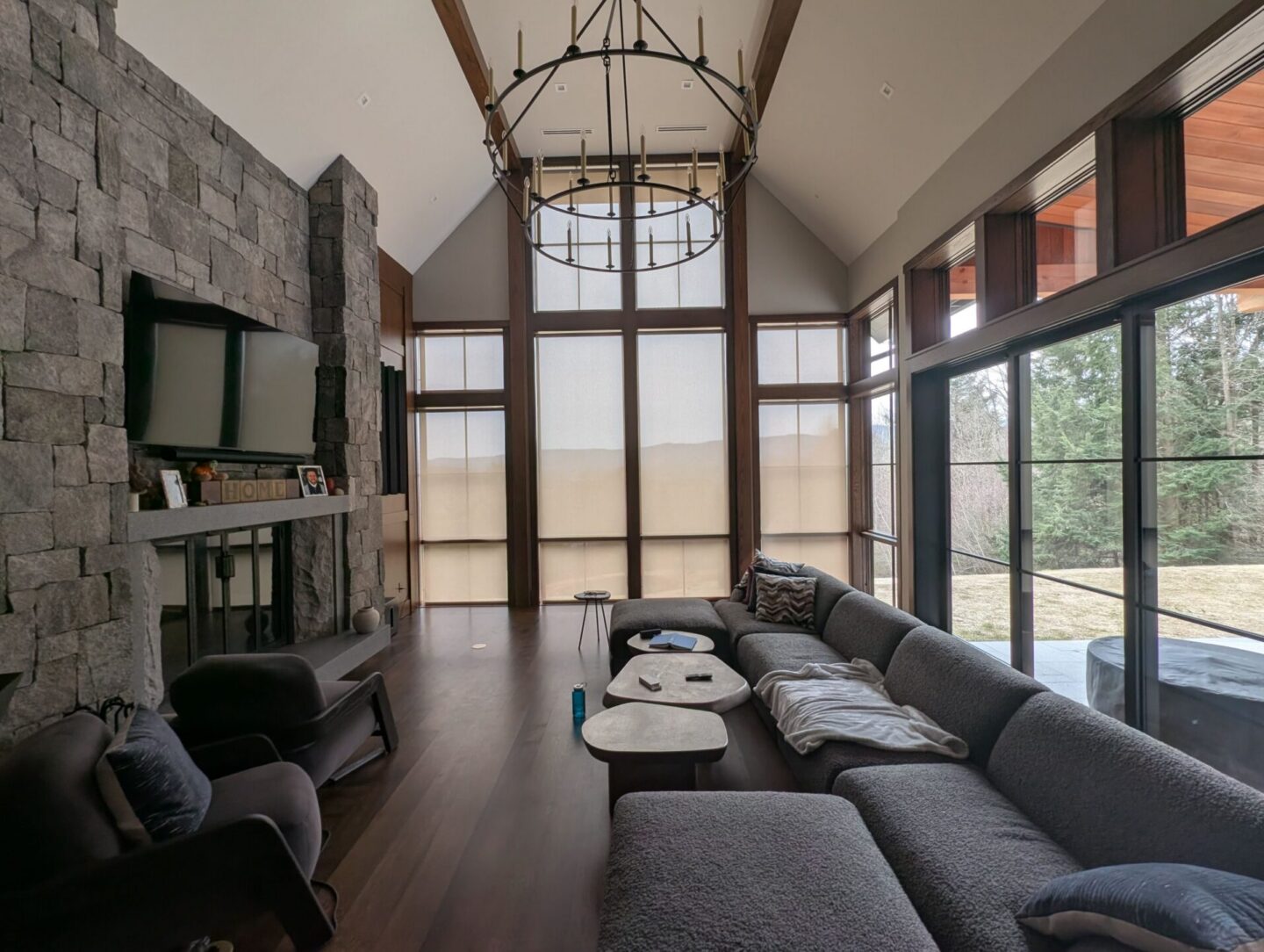 Motorized Shades in large windows also help reduce heat gain during sunny afternoons while still preserving views when raised, the perfect balance of function and style, in our opinion!